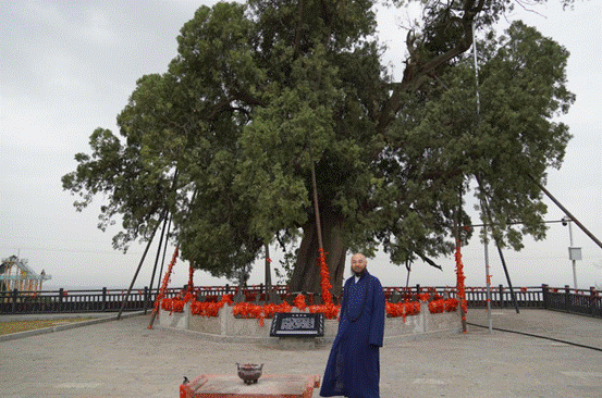 Venerable Wanxing poses with the “Sacred Cypress of Yu the Great”. (Photo by Li Yingjing)