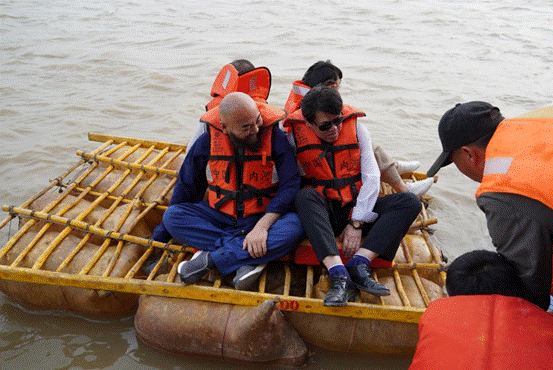 Venerable Wanxing and the delegation experience a millennium-old traditional raft on the Yellow River. (Photo by Li Yingjing)